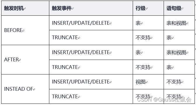 - 当前仅支持在普通行存表上创建触发器,不支持在列存表、临时表、unlogged表等类型表上创建触发器。