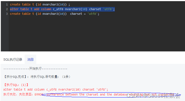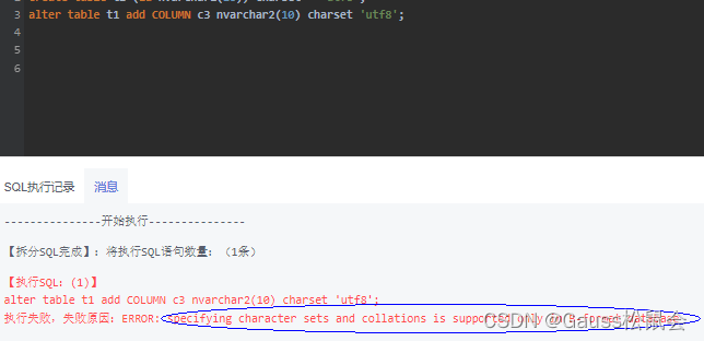 4. 增加列时指定charset会怎么样呢?个人理解,由于GaussDB是在openGauss基础上进行的云化,因此也只在B模式下支持,见下图: