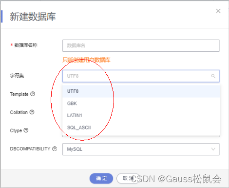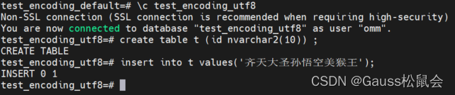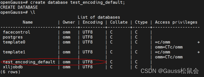 5. 可见在GaussDB以及openGauss中,创建数据库时要确定好字符集,否则数据库创建好后,就无法再在低一级的Schema,table和Column中重新制定,遇到不适用的场景只能重新建库。
