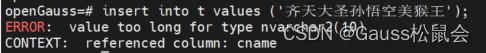 故事是这样开始的。我们的小DEMO项目的数据库版本从openGauss 2.1.0升级到了5.0.0版本。升级后进行功能验证的时候,测试同学发现个BUG,原来通过gs_restore导出来的数据再导入时报超长,插入失败了,如下图所示,nvarchar(10)的字段类型,无法插入10个汉字—“齐天大圣孙悟空美猴王”。