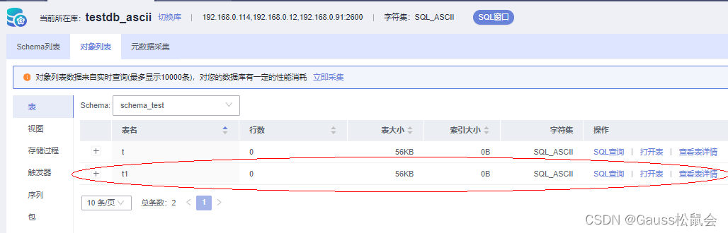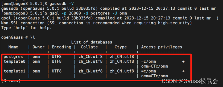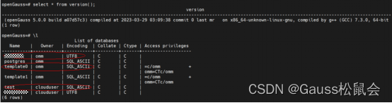 查看了数据库列表,确认字符集的异同,为了区分截图,同时查询了openGauss的数据库版本。发现2.1.0版本的模板数据库(template0,template1)的字符集(Encoding)是UTF8,而5.0.0版本的模板数据库(template0,template1)的字符集(Encoding)是SQL_ASCII。