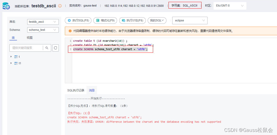 2. 那么GaussDB支持创建scheme的时候指定和database的encoding不同的charset吗?试试看,我们创建了一个数据库testdb_ascii,字符集是SQL_ASCII。然后在该数据库中创建一个schema,charset指定UTF8,执行时报错还不支持。