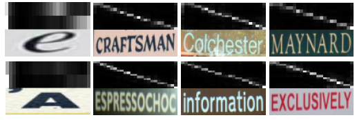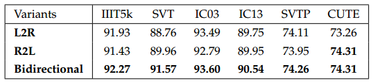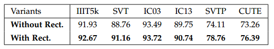 结论: 矫正对一般水平样本(IIIT5k,IC03,IC13)略有提高,对形变比较大的不规则样本(SVT,SVTP,CUTE)提高3~4个点