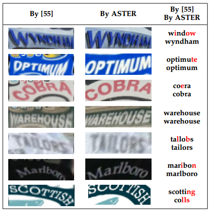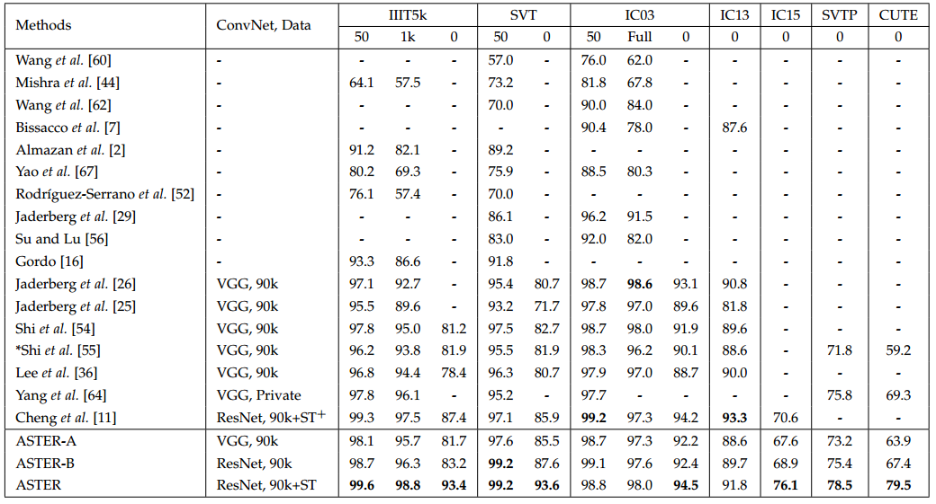 - 这篇文章和之前的RARE从方法介绍上看,几乎没什么变化,作者说不同点一个是有进行resize,另一个是localization network的fc激活函数从tanh换成一般的value clipping。这两点变化都不大,但效果比RARE好很多,具体原因有待探讨