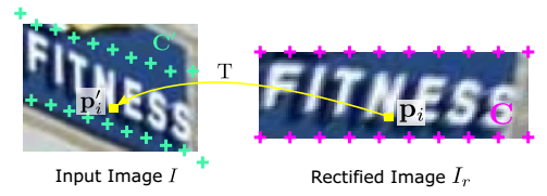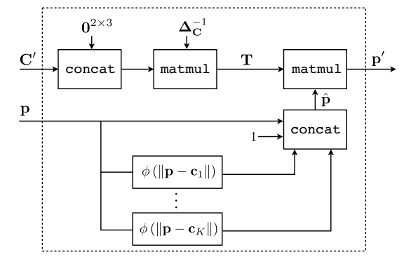网格生成器可以看成是一个矩阵变换操作(变换的几个参数a0-a2, b0-b2可以通过Control point位置利用优化问题求解方法求出,因为Control Point在矫正前后的图上的位置都是已知的,故可以计算出对应关系),实际做预测时也是计算该待测点与已知的control point的位置关系,通过一系列对应关系算出在原图的位置。贴个图感受一下这个对应关系如下,p为矫正后的点位置,C为矫正后的Control point的点位置,p'为矫正前的点位置,C’为Control point在矫正前的点位置: