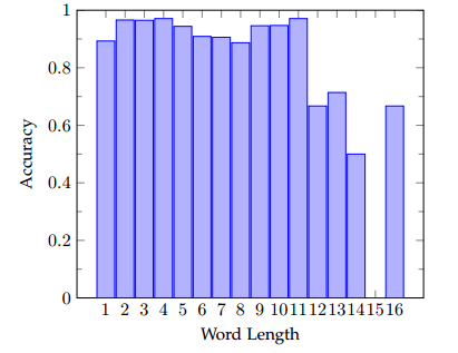 结论: 字符小于11时,识别精度差不多,大于11后精度有所下降,因为长文字本身更难