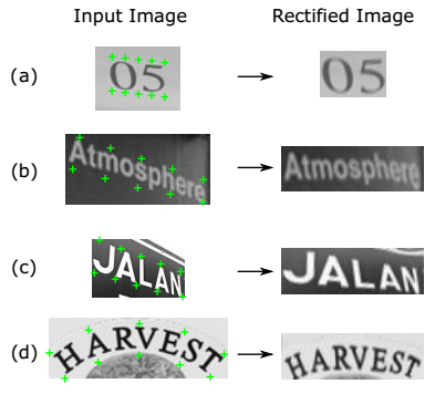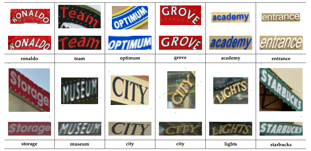 Selected results on SVT-Perspective and CUTE80. For every two rows, the first row contains the input images (top), the predicted control points (visualized as green crosses), and the rectified images (bottom). The second row contains the recognition results.