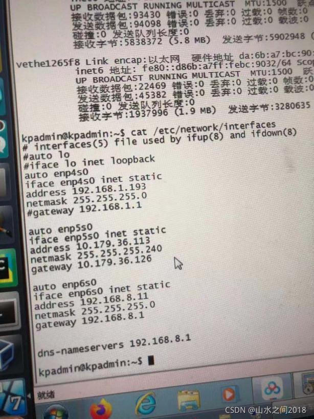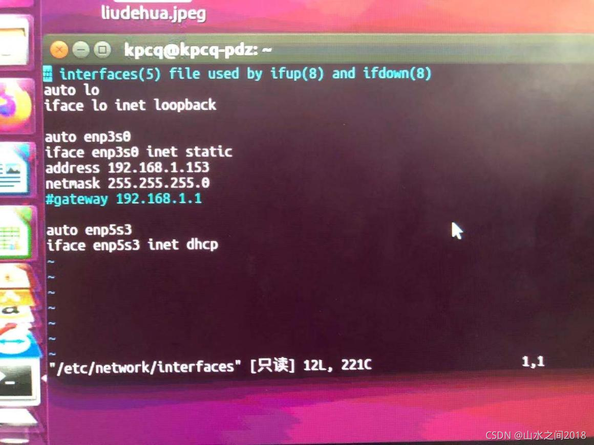 终端输入ifconfig,确认Ethernet硬件地址对应的device名称,如下,这里两个网卡分别是enp3s0与enp5s3,前者对应内网ip,自行设置的一个ip;后者对应无线路由器ip,动态获取的,注意这个也可静态指定。