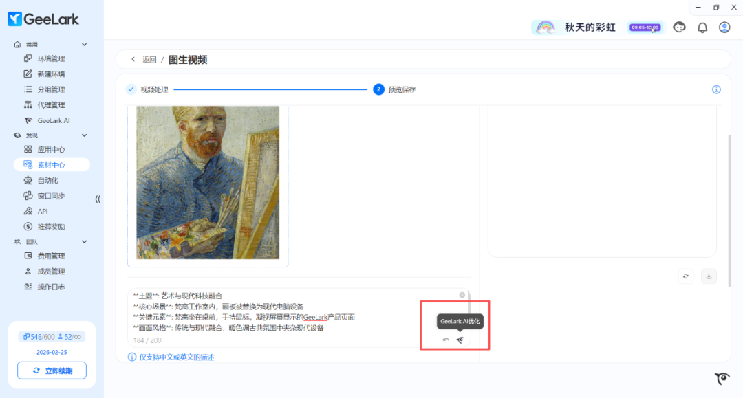 并且,在使用图生视频功能时,你可以借助 GeeLark AI 一键优化你的文案描述,协助你优化图生视频的提示词,使其能更精准地传达创作需求,从而生成更符合预期的视频内容。