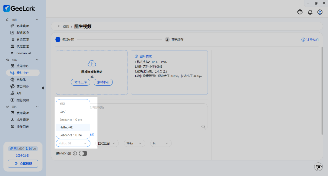 在最新版本中,GeeLark AIGC(图生视频)现已接入 MiniMax-Hailuo02 大模型。你可以在视频生成的基础设置中选择合适的 AI 大模型,结合其强大的多模态生成能力和云计算基础设施,为跨境个人卖家或团队运营者提供高效、灵活的视觉内容生产解决方案。