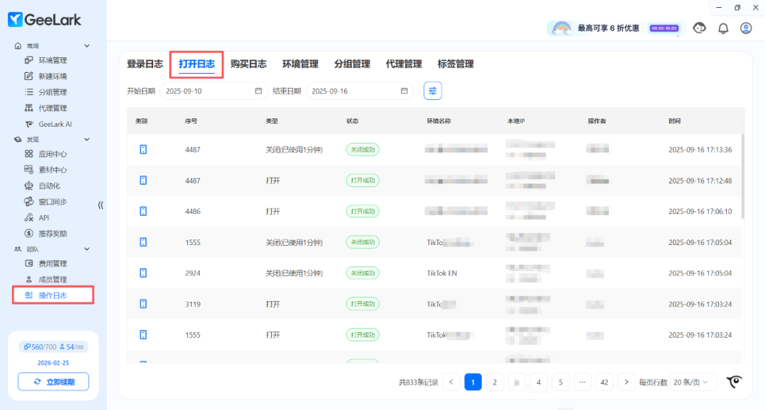 A:有。你可以点击左侧“操作日志”——“打开日志”里查看,同时支持筛选成员、序号等,更加方便查找。