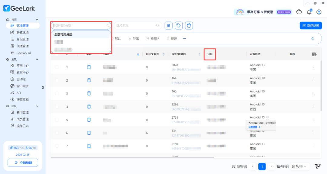 2. 如果分组管理正确,你可以点击环境管理,检查分组搜索框处是否筛选了某个分组。