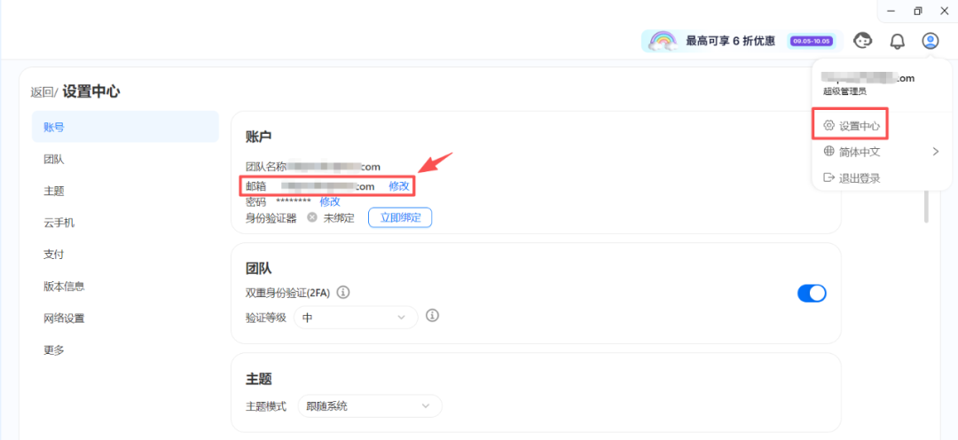 A:你需要登录超级管理员身份的账号,在右上角设置中心处,即可修改超级管理员邮箱。