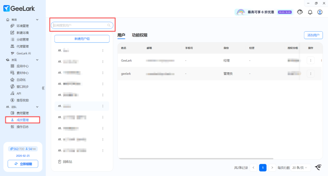 A:1. 点击“成员管理”,输入账号名即可全局搜索用户,查看设置的成员是否授权了对应的分组;