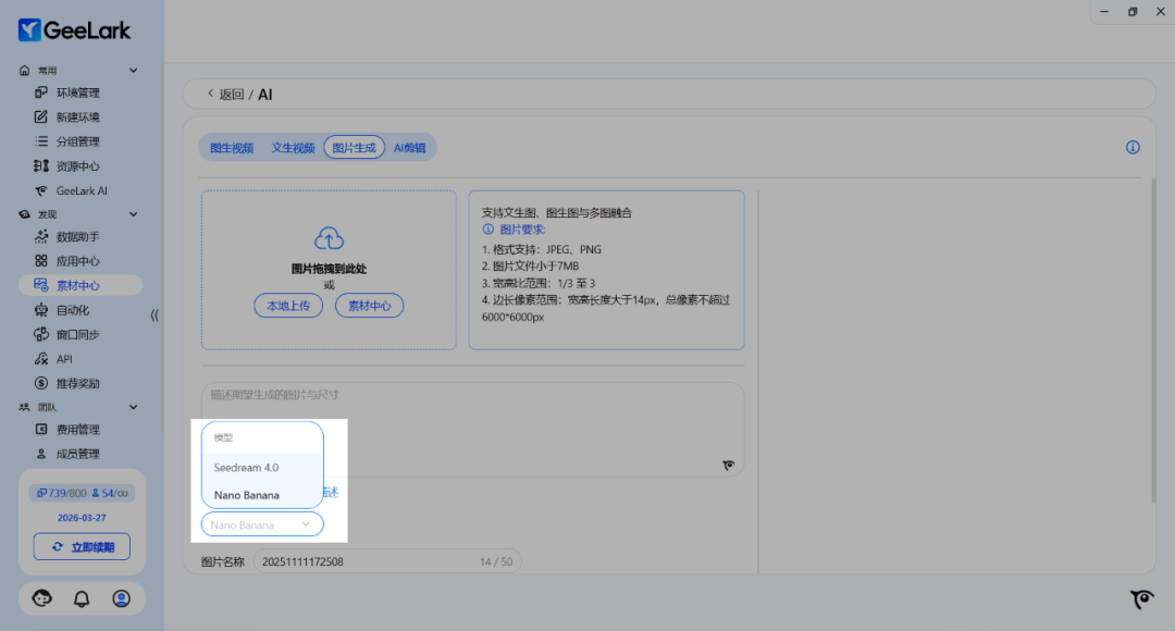 在 GeeLark 最新版本中,AIGC 图片生成功能现已接入 Nano Banana 与 Seedream 4.0大模型。此功能支持文生图、图生图与多图融合,你可以根据自己的要求填写文案或上传图片,通过 GeeLark AI 优化文案,不断调整提示词,轻松生成更符合你运营风格的图片。