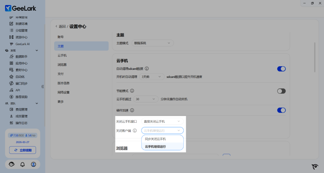 在 GeeLark 最新版本中,你可以在右下角找到“设置中心”-“主题”自定义设置关闭云手机窗口和关闭客户端时云手机的运行状态。