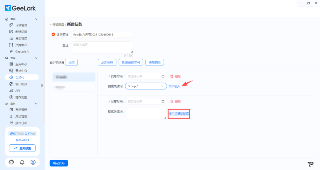 在 GeeLark 最新版本中,在“自动化”栏目选择“ Reddit AI 养号”自动化模板,添加任务后可以选择手动输入或使用关键词词库搜索。