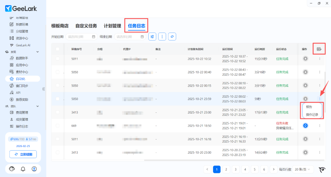 在 GeeLark 最新版本中,“自动化”栏目的“任务日志”里,点击最右方三点,查看对应环境的用户操作记录和运行报告,可以清晰看到每个账号每天执行了哪些任务,可以实时查看所有用户的操作流水。