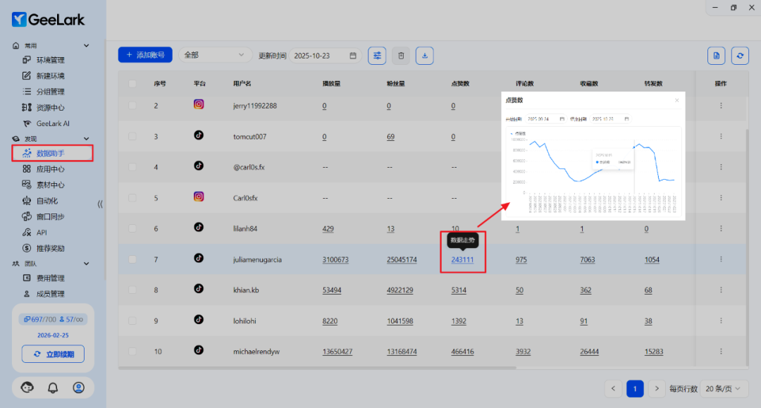 在 GeeLark 最新版本中,你可以通过 AI 数据助手栏目查看平台账号的数据走势图,添加账号查询后,点击你想要查看的数据即可,可以直观地判断市场活动的投入产出比。