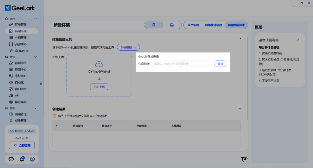 在 GeeLark 最新版本中,“新建环境”-“表格批量创建”支持 Google 在线表格导入。当你更新 Sheet 中的信息时,通过解析此表格链接能一键同步更新环境创建信息,保证了协作信息的准确性和时效性。