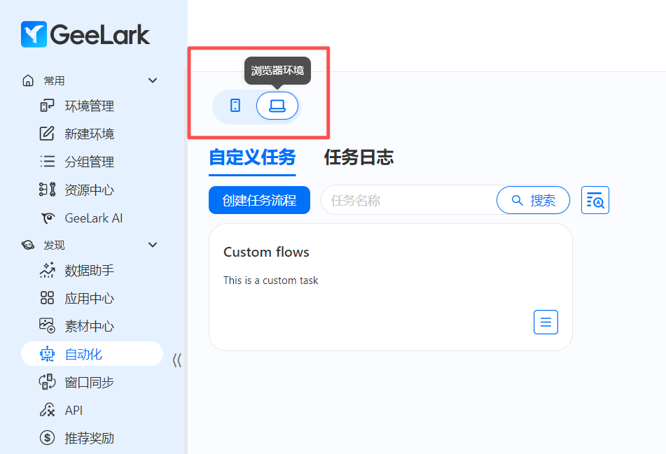 在 GeeLark 的最新版本中,自动化栏目新增了浏览器自定义任务板块。通过切换“浏览器环境”板块,你可以自定义任务流程,并根据需求设置指纹浏览器相关运营自动化操作。