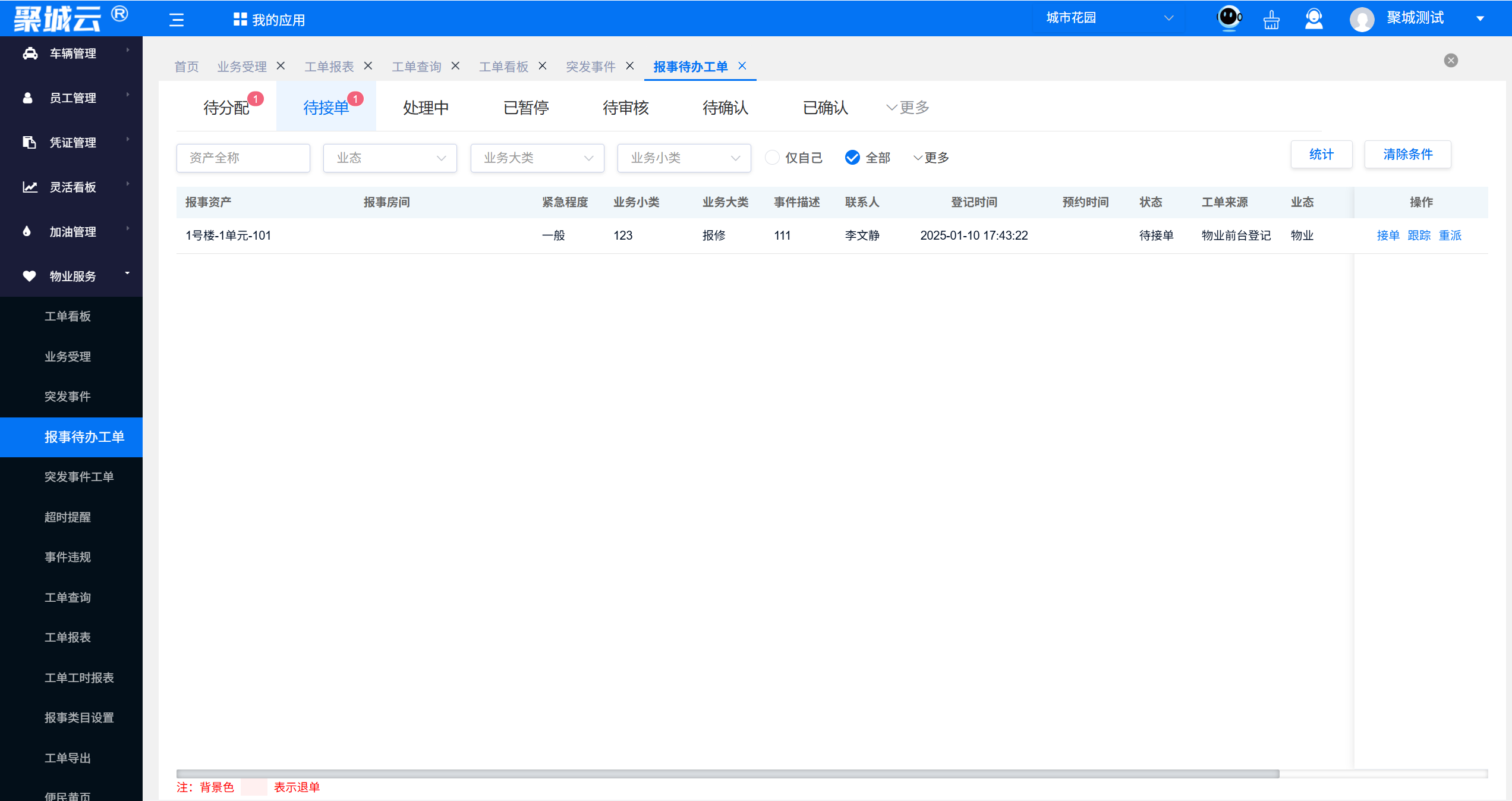 - 跨部门协同流转:支持对接物业 OA 系统与维修工单系统,隐患上报后自动生成维修工单并分配至对应班组,处理进度实时更新(已接单 / 已分派 / 处理中 / 已完成 / 已审核),管理员与业主均可在线查看。