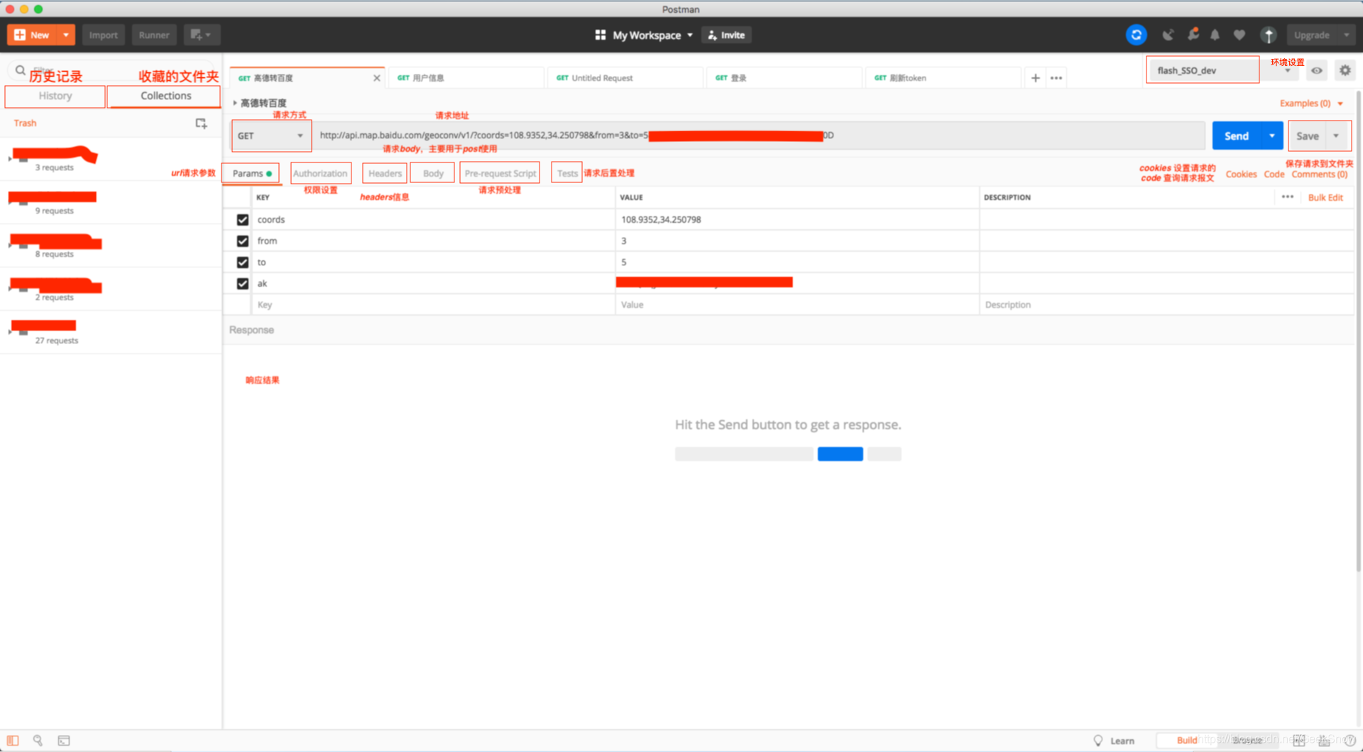 首先先看一张图,了解postman工具的页面有哪些功能。分别有能哪些作用,后面再以请求方式细讲功能,及使用方式
