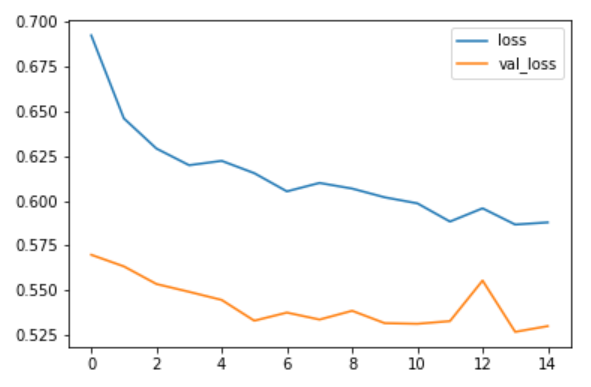 Train on 60000 samples, validate on 10000 samples Epoch 1/15 60000/60000 [==============================] - 5s 81us/sample - loss: 0.6924 - acc: 0.7534 - val_loss: 0.5699 - val_acc: 0.7996 Epoch 2/15 60000/60000 [==============================] - 4s 72us/sample - loss: 0.6461 - acc: 0.7688 - val_loss: 0.5634 - val_acc: 0.8051 Epoch 3/15 60000/60000 [==============================] - 4s 75us/sample - loss: 0.6292 - acc: 0.7754 - val_loss: 0.5536 - val_acc: 0.8108 Epoch 4/15 60000/60000 [==============================] - 4s 73us/sample - loss: 0.6199 - acc: 0.7784 - val_loss: 0.5492 - val_acc: 0.8065 Epoch 5/15 60000/60000 [==============================] - 4s 73us/sample - loss: 0.6223 - acc: 0.7772 - val_loss: 0.5447 - val_acc: 0.8121 Epoch 6/15 60000/60000 [==============================] - 4s 73us/sample - loss: 0.6155 - acc: 0.7783 - val_loss: 0.5331 - val_acc: 0.8164 Epoch 7/15 60000/60000 [==============================] - 4s 73us/sample - loss: 0.6053 - acc: 0.7810 - val_loss: 0.5377 - val_acc: 0.8136 Epoch 8/15 60000/60000 [==============================] - 4s 74us/sample - loss: 0.6100 - acc: 0.7821 - val_loss: 0.5338 - val_acc: 0.8220 Epoch 9/15 60000/60000 [==============================] - 4s 74us/sample - loss: 0.6069 - acc: 0.7830 - val_loss: 0.5387 - val_acc: 0.8169 Epoch 10/15 60000/60000 [==============================] - 4s 74us/sample - loss: 0.6020 - acc: 0.7843 - val_loss: 0.5317 - val_acc: 0.8223 Epoch 11/15 60000/60000 [==============================] - 4s 74us/sample - loss: 0.5986 - acc: 0.7856 - val_loss: 0.5314 - val_acc: 0.8196 Epoch 12/15 60000/60000 [==============================] - 5s 78us/sample - loss: 0.5884 - acc: 0.7900 - val_loss: 0.5329 - val_acc: 0.8188 Epoch 13/15 60000/60000 [==============================] - 5s 76us/sample - loss: 0.5959 - acc: 0.7835 - val_loss: 0.5555 - val_acc: 0.8087 Epoch 14/15 60000/60000 [==============================] - 4s 74us/sample - loss: 0.5868 - acc: 0.7871 - val_loss: 0.5269 - val_acc: 0.8304 Epoch 15/15 60000/60000 [==============================] - 5s 75us/sample - loss: 0.5880 - acc: 0.7862 - val_loss: 0.5301 - val_acc: 0.8230