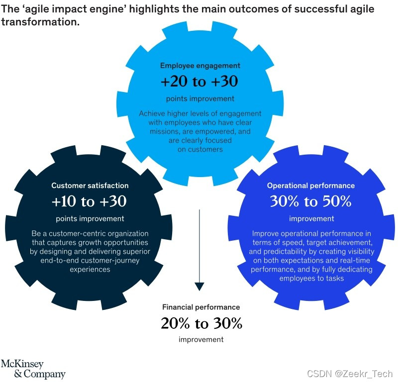 著名的咨询公司麦肯锡研究了全球企业级的敏捷实践推广, 从中分析的由此转变得到影响。包含了总共有22个组织的6大部分,得到的结论敏捷的优势主要表现在三个方面