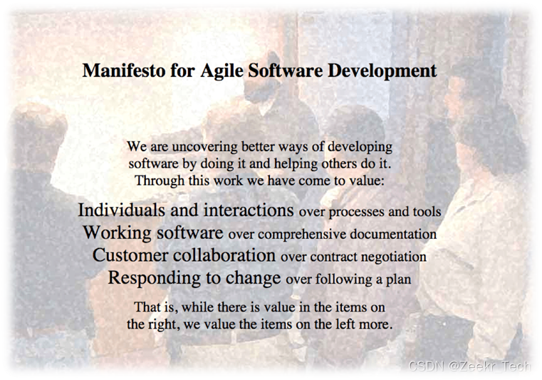 敏捷开发思维登场!简单介绍一下敏捷开发的历史:上世纪90年代,在美国硅谷的一些工程师在一起讨论为什么软件工程交付和质量变得越来越差,有什么样的方法可以改变这样的现状?在这样的背景下面,2001年,倡导轻量化和更多迭代开发方法的思想领袖们,聚集在了美国犹他州的雪鸟小镇。虽然大家所提出的方法各不相同,但是与会者一致认为这些方法所遵循的共同价值和信仰,最终提出了具有转折性意义的“敏捷软件开发宣言”。 如下图内容所示