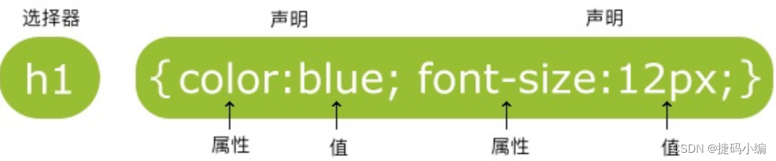 选择器通常是你需要改变样式的 HTML 元素。每条声明由一个属性和一个值组成。