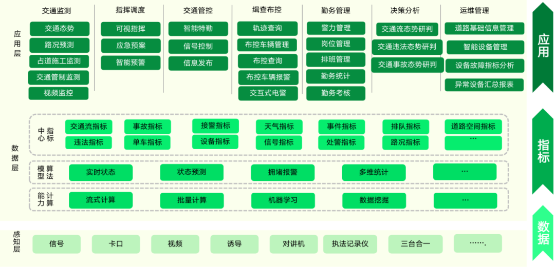 智慧交通集成管控平台通过统一标准,集成交警各类业务系统、整合相关数据资源、深入挖掘情报信息、掌控勤务安排,打破交通综合管控壁垒,支撑交警从“碎片化管理”向“集中化管理”的新型管理模式转变,实现常态下监测管理,应急态下协同处置、指挥调度,全面提升交通管理部门可视化指挥、决策能力。