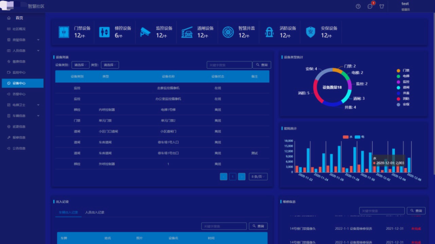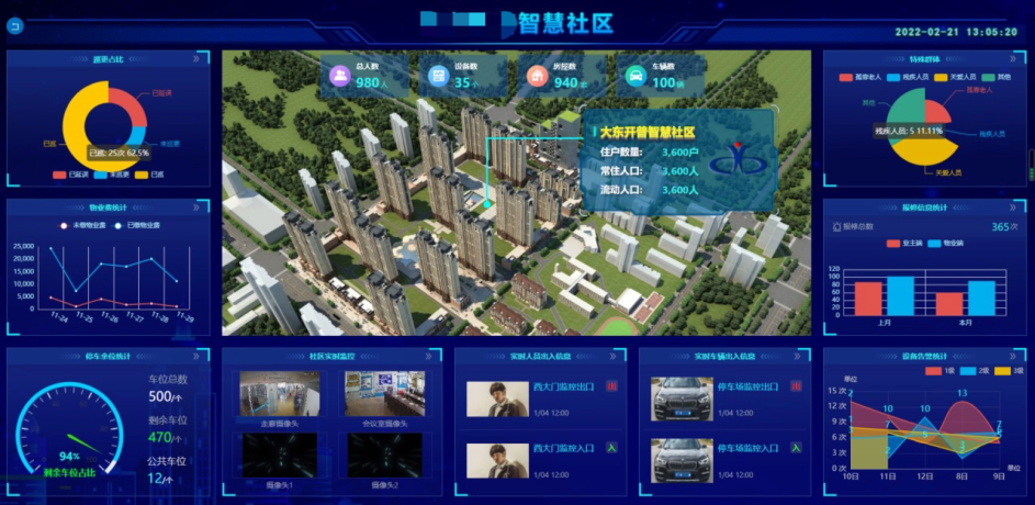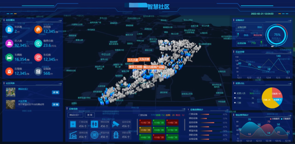 页面通过物联网采集设备数据,展现社区布局图、巡更、缴费信息、车位、实时监控、实时出入信息、特殊群体、报修数据、设备告警统计等,通过可视化数据的方式,一张图展现社区概况,保证管理人员直观了解社区情况。