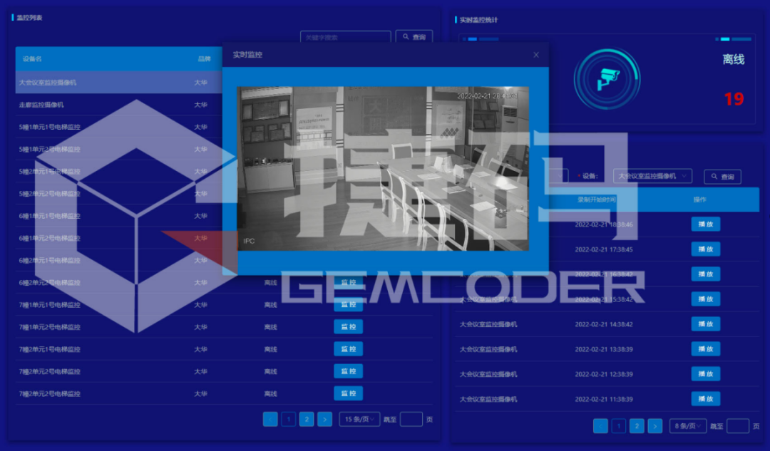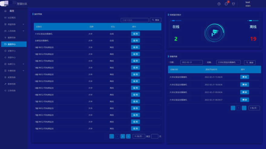板块内集成接入小区内所有的监控设备,管理人员可以查看监控设备列表、监控设备在线/离线数、录像数据列表,对表内的信息进行浏览。