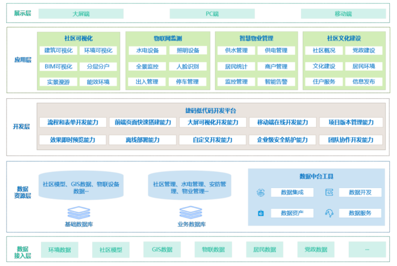 智慧社区是充分借助物联网、传感网、网络通讯技术,融入居民生活的各个环节当中,实现从家庭无线宽带覆盖、家居安防、家居智能、家庭娱乐、到社区智能化为一体的理想生活。基于多种物联数据、业务数据,建立标准化数据库,运用数据中台进行统一清洗管理,基于低代码开发平台,快速搭建智慧社区服务平台,搭载大屏端、PC 端、移动端,形成多种专题应用,将居民、物业、商家、开发商全面整合,挖掘社区范围内外资源潜力,建设生态高效、信息发达、经济繁荣新型现代化社区服务。