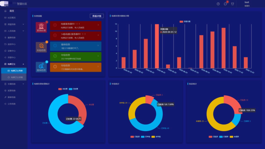 针对电梯硬件,进行全方位的平台监管,页面内展示信息包括告警提醒展示、电梯告警次数统计图、电梯告警处理统计、年检统计、维保统计等,帮助管理人员跟踪电梯运行情况,让社区的电梯事故率降到最低。