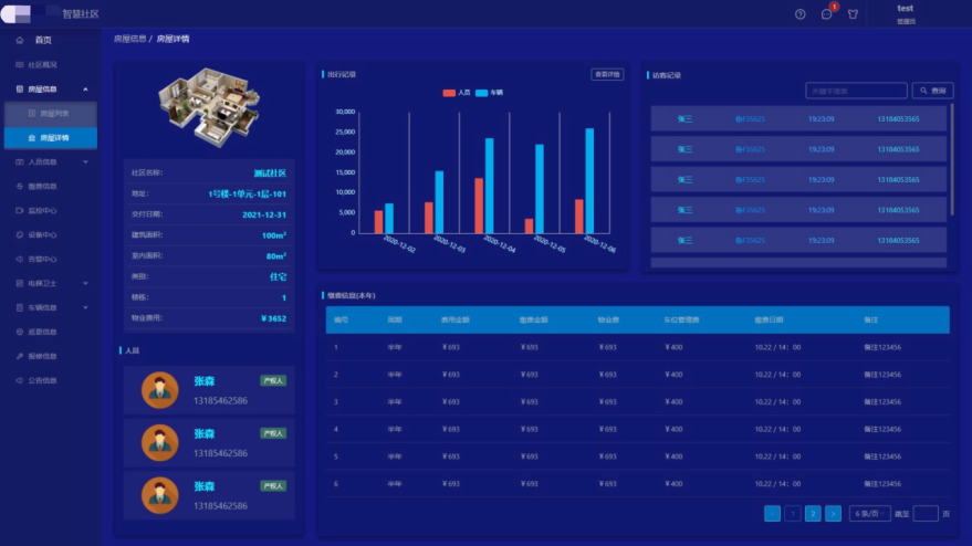 系统通过接入数据库,展现房屋各种信息,包括房屋详细信息、房屋人员信息、房屋人员出行记录、访客记录、缴费信息等,有助于管理人员查询过往信息,进行信息回溯。