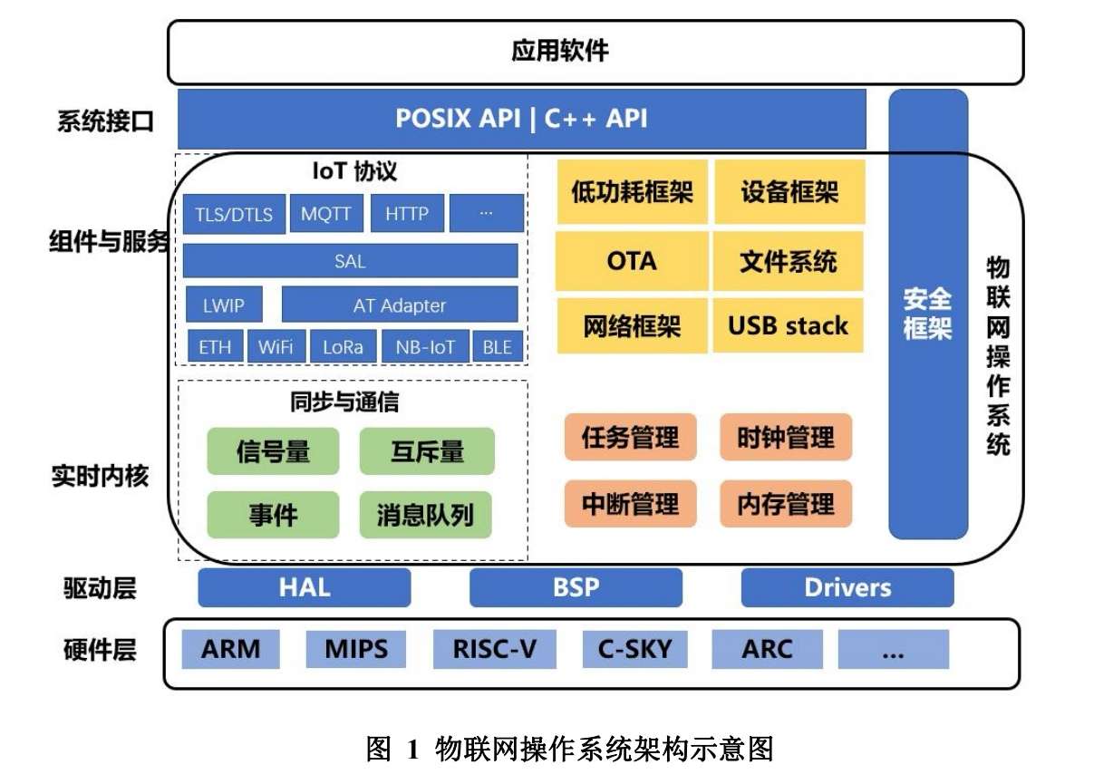 物联网操作系统是支持物联网技术大规模发展的核心基础软件,包括操作系统内核、外围组件和服务、物联网安全框架等,以支持构成具有低功耗、安全通信属性的物联网软件平台。物联网操作系统的内核通常具备任务管理、中断管理、异常处理、时钟管理、存储管理、同步与通信等功能。物联网操作系统向下协调和控制各类软件硬件资源,向上提供统一的应用编程接口,降低物联网应用开发的复杂度、成本和时间。物联网操作系统的架构图如下所示: