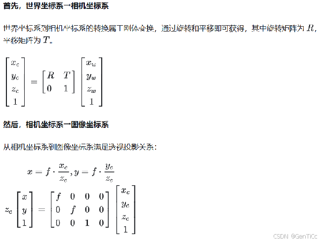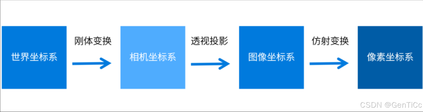 相机坐标系:以相机的光心为坐标原点,x轴和y轴平行于图像坐标系的x轴和y轴,z轴为相机的光轴。