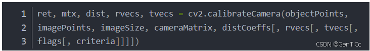 使用 OpenCV 标定的流程是:角点提取 -> 相机标定。 角点提取FindChessboardCorners() 相机标定,用calibrateCamera()实现,原型如下: 3. 我们一般只用输入前三个参数,后面的指定为None,objpoints在前面角度检测获得,imgpoints则根据坐标系定义,imgsize为图像的像素尺寸大小。我们将这些参数输入进函数之后就可以得到相机的内参以及畸变参数。