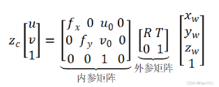 转换过程不需要掌握,最终,想要完成两个坐标系中的转换只需要得到相机的内参矩阵与外参矩阵。内参矩阵取决于相机内部参数,外参矩阵取决于相机坐标系和世界坐标系的位置。而相机标定,就可以帮我们求解出内参矩阵和外参矩阵。