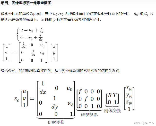 像素坐标系:与成像平面重合,以成像平面的左上角顶点为原点,x 轴和 y 轴分别平行于图像坐标系的x轴和y轴。