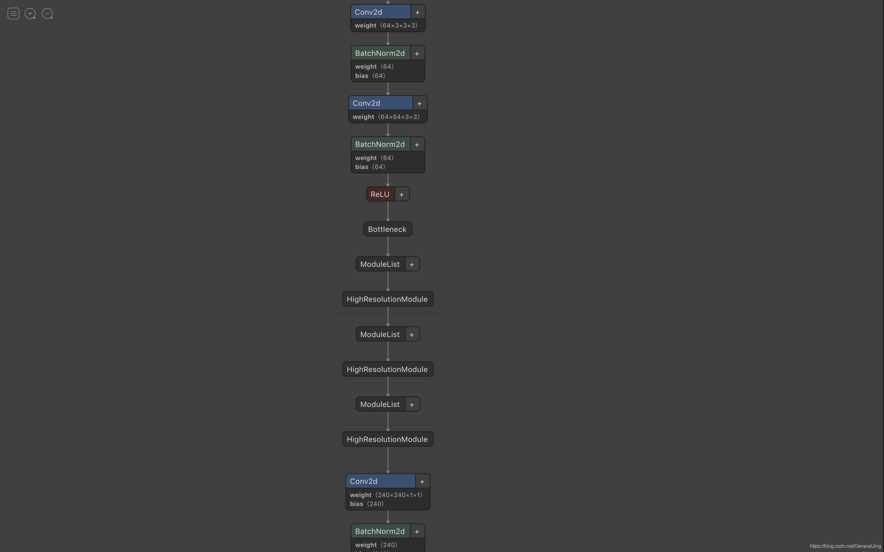 最近在做跟hrnet相关的一些工作,需要查看网络的结构,对某些网络层需要进行特别的处理,所以需要对网络结构进行可视化。一开始想到的就是netron,但是由于hrnet网络中对层进行了封装处理,所以得到的是如下示意图: