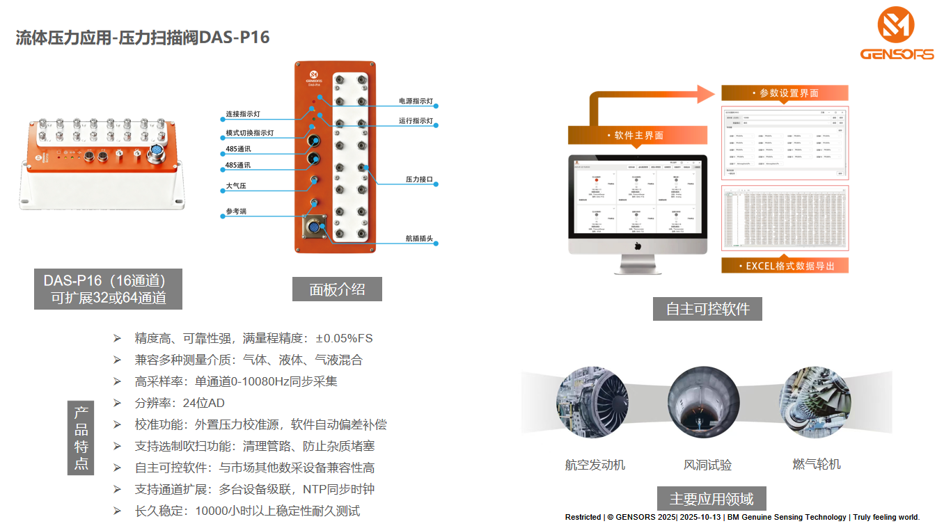 - 解决方案:Gensors DAS-P16压力扫描阀部署五孔探针 + 多台扫描阀并行采集,实现全截面同步扫描,校验时间缩短至 20 分钟;
