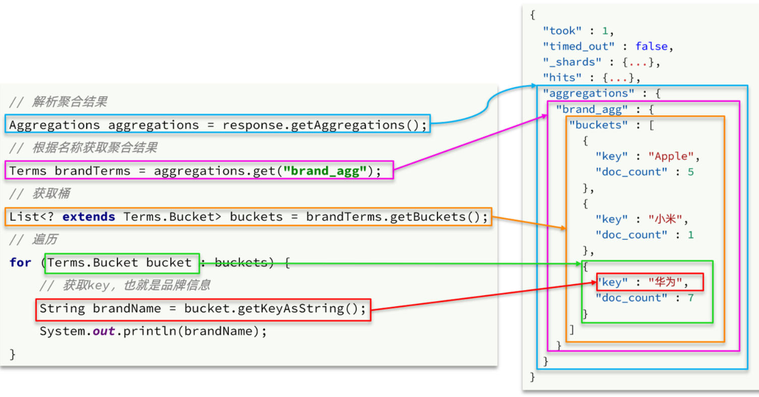 聚合结果与搜索文档同一级别,因此需要单独获取和解析。具体解析语法如下: