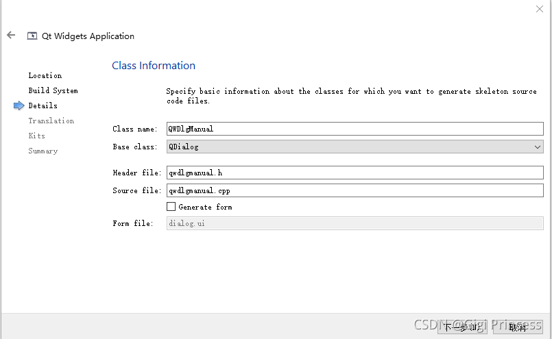 首先建立项目,基类选择QDialog,新类名称命名为QWDlgManual