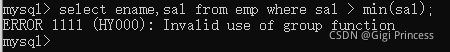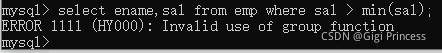 select ename,sal from emp where sal > min(sal);//报错。