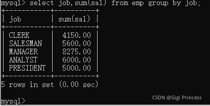 select job,sum(sal) from emp group by job;