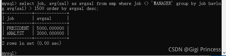 select job, avg(sal) as avgsal from emp where job <> 'MANAGER' group by job having avg(sal) > 1500 order by avgsal desc;
