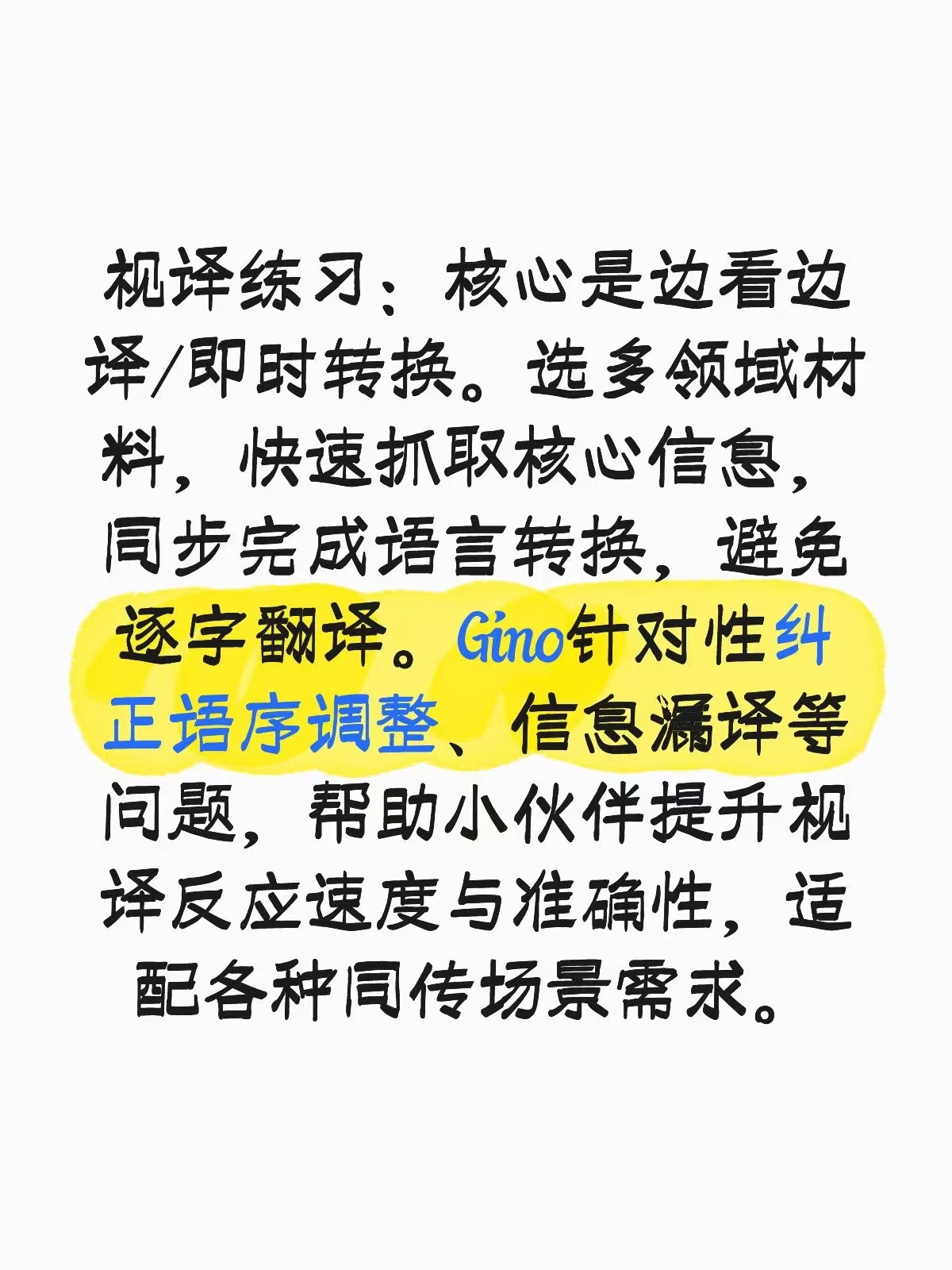 视译练习:核心是边看边译/即时转换。选多领域材料,快速抓取核心信息,同步完成语言转换,避免逐字翻译。Gino针对性纠正语序调整、信息漏译等问题,帮助小伙伴提升视译反应速度与准确性,适配各种同传场景需求。